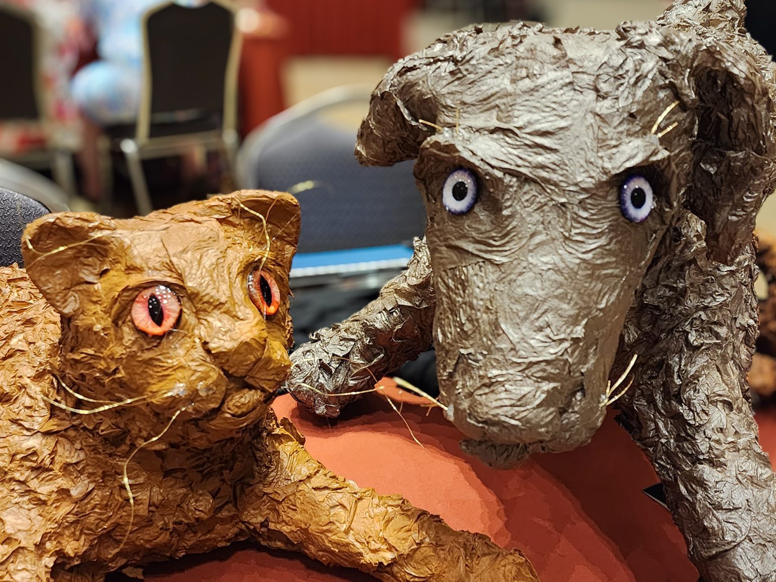 Seeing Things Differently is the hallmark of the artist! My friend and artistic mentor Hazel Belvo taught me years ago that ‘having fun little things on you’ was great in catching the attention of your students; sharing her amazing charm necklace. I began turning many vintage and non-traditional items into jewelry, mostly earrings, years ago. It’s been fun in a city the size of Duluth to see ‘my earrings’ on people around town! Even a woman who has to ‘business-dress’ can enjoy her funky side with some dinosaur earrings to wear with her suit to work! I also make ‘stuffed paintings’ – cotton muslin pillows that have been painted into cats, mermaids, moons, suns, trees, etc. Handbags made of crocheted plastic bag strips are another favorite – I can’t make them fast enough for those who want them!